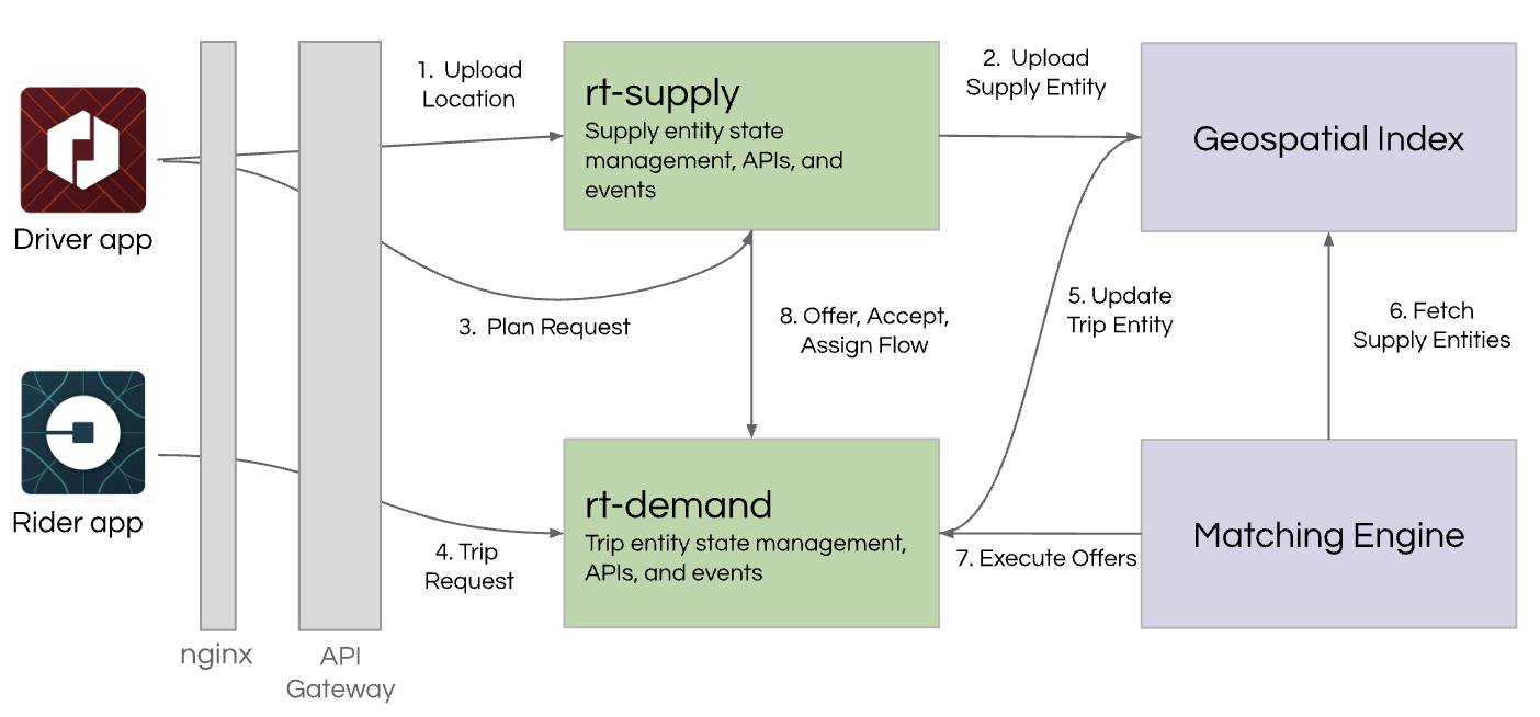 The original dispatch service was designed for more simplistic transportation (one driver-partner and one rider). There were deep assumptions that Uber only needed to move people and not food or packages. Its state of available driver-partners was sharded by city. And some cities were seeing massive growth of the product.