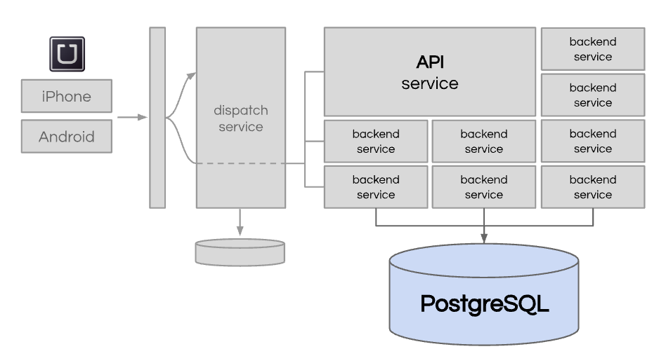 While Uber was creating many new backend services, they all continued to use one single PostgreSQL database.