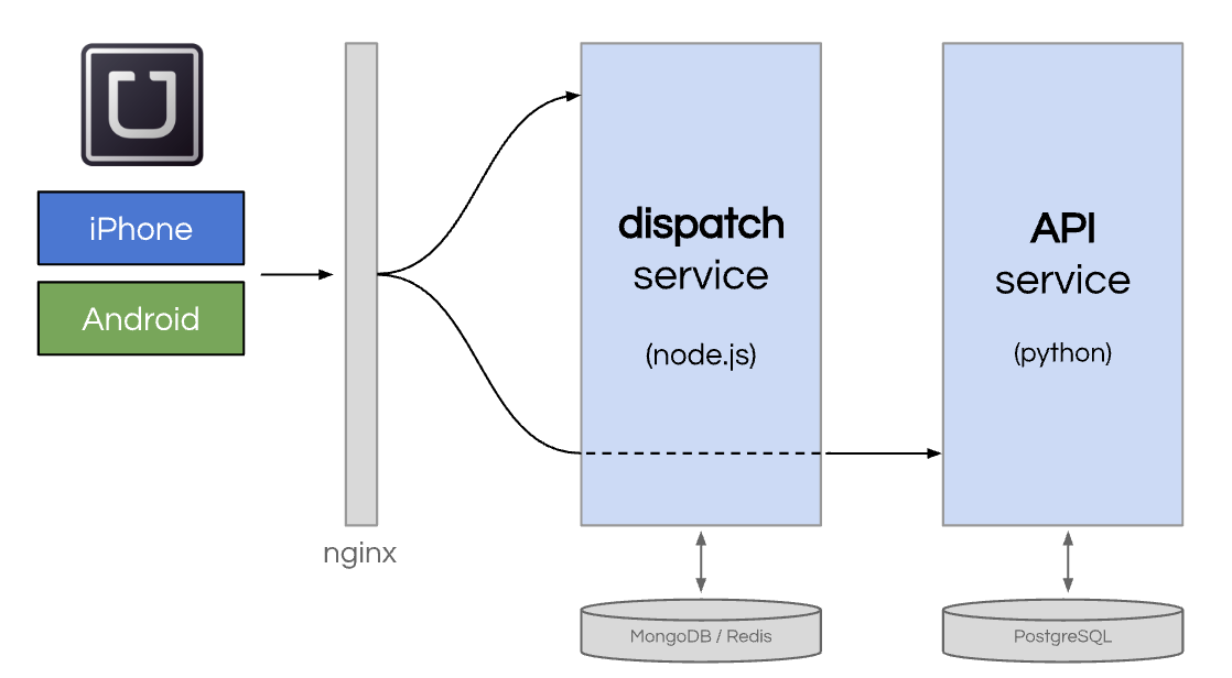The resulting architecture was two services. One built in Node.js (“dispatch”) connected to MongoDB (later Redis) and the other built in Python (“API”) connected to PostgreSQL.